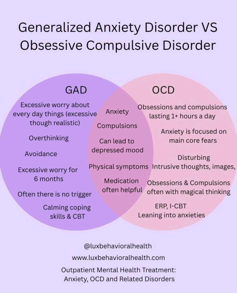 I recently made a visual for our Lux Behavioral Health instagram page to highlight key differences and similarities with OCD and GAD. There is much more to it but I hope this visual is a helpful place to start.